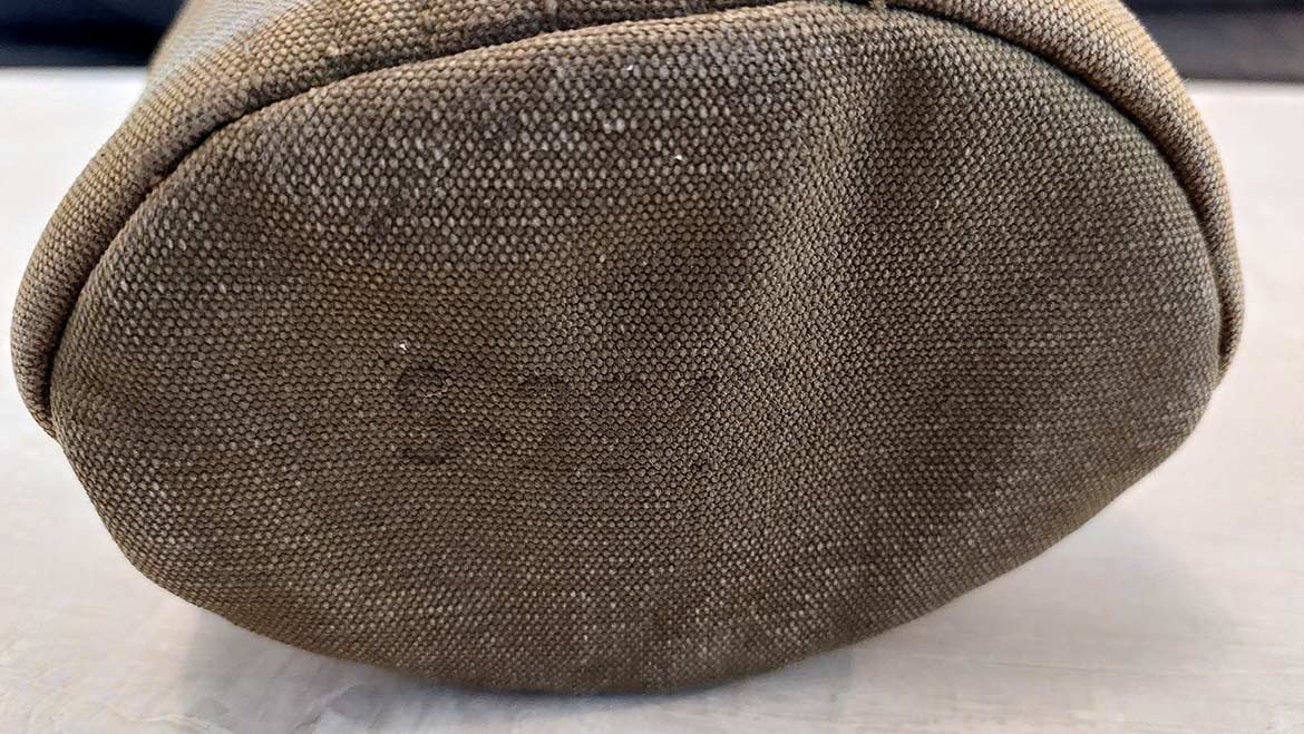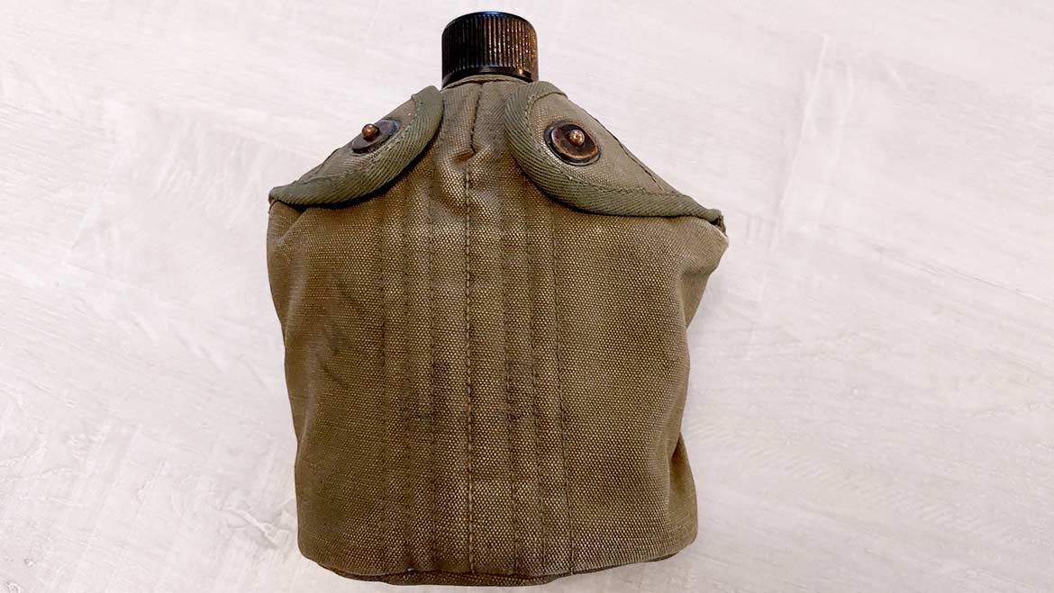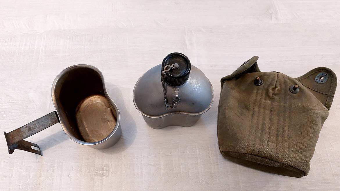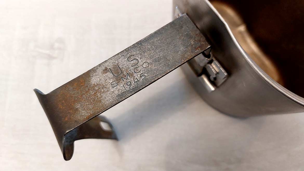 Le quart qui l'accompagne, en acier inoxydable, daté de 1945, est pourvu du bord du type "franc est évasé".