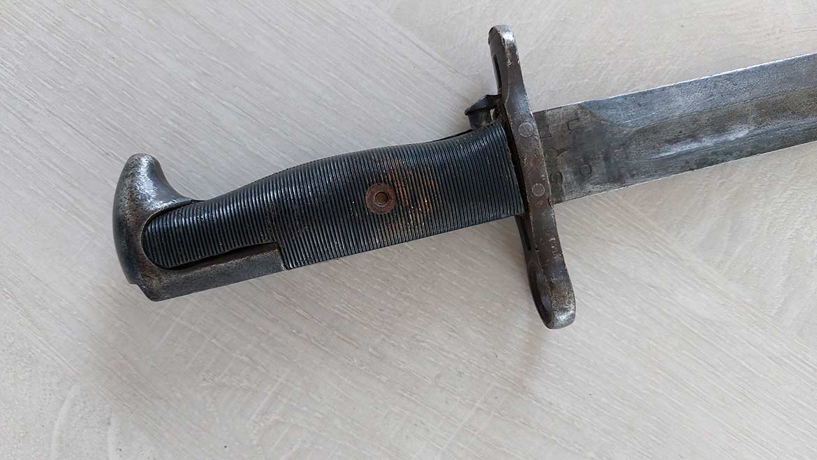 Le manche de la baïonnette est en métal, souvent muni d'un revêtement en bakélite ou en plastique dur pour une meilleure prise en main. Il comporte également une garde pour protéger la main de l'utilisateur.